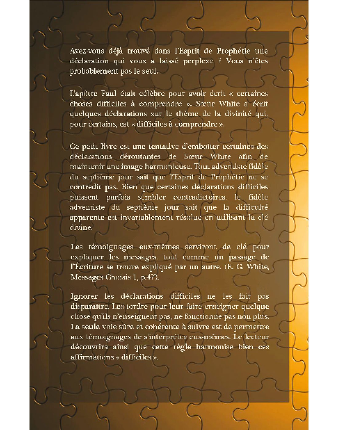 Ce petit livre est une tentative d’emboîter certaine des déclarations déroutantes de Sœur White afin de maintenir une image harmonieuse. Tout adventiste fidèle du septième jour sait que l’Esprit de Prophétie ne se contredit pas. Bien que certaines déclarations difficiles puissent parfois sembler contradictoires, le fidèle adventiste du septième jour sait que la difficulté apparente est invariablement résolue en utilisant la clé divine.